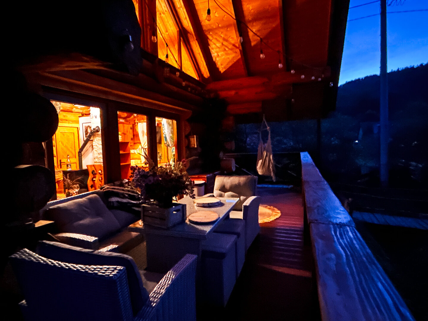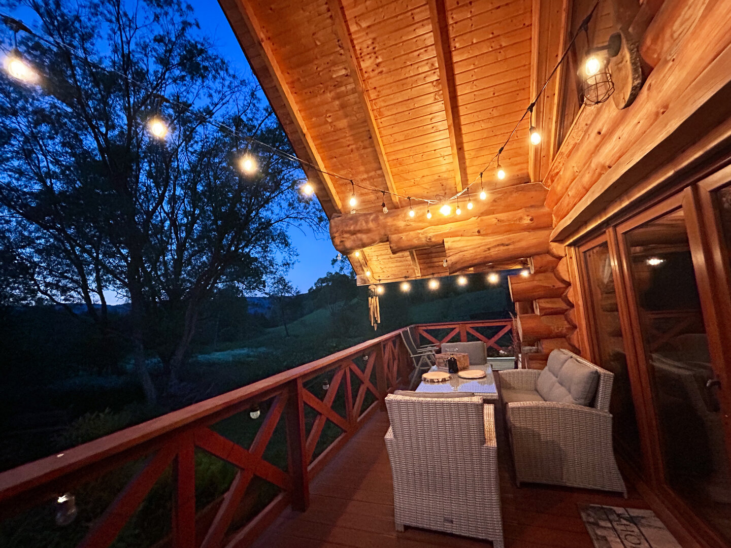 Taras widokowy: Miejsce na poranną kawę z widokiem na otaczające lasy i bieszczadzkie wzgórza.